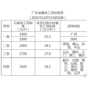 11月26日消息,廣東省人民政府印發(fā)《通知》決定,從2021年12月1日起調(diào)整月最低工資標(biāo)準(zhǔn)。此次調(diào)整仍保持四類標(biāo)準(zhǔn),其中廣州、深圳執(zhí)行一類標(biāo)準(zhǔn),廣州調(diào)至2300元/月,深圳調(diào)至2360元/月,二類1900元/月,三類1720元/月,四類1620元/月。