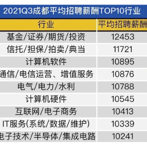 10月13日消息,智聯(lián)招聘發(fā)布《中國企業(yè)招聘薪酬報告》顯示,成都2021第三季度平均招聘薪酬9291元/月,位居全國第15位。成都基金/證券/期貸/投資行業(yè)第三季度月均工資達12453元,信托/擔保/拍賣/典當行業(yè)為11721元/月。