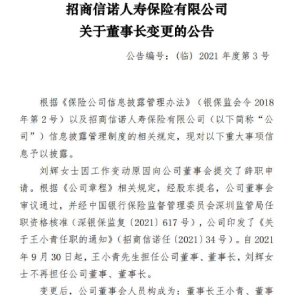 10月13日消息,招商信諾人壽稱,董事長劉輝離職,接任者為招商基金董事長王小青。王小青1992年7月至2005年4月先后在中國農(nóng)業(yè)銀行江蘇省海安支行、海通證券基金投資部、中國證監(jiān)會上海專員辦、天一證券工作。