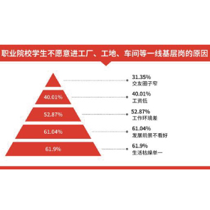 10月11日消息,中國青年報(bào)發(fā)布的調(diào)查顯示,61.9%受訪職業(yè)院校學(xué)生會(huì)因一線生活枯燥單一而不愿意去制造業(yè)基層,61.04%對制造業(yè)基層工作前景不看好。此外,32.8%職業(yè)院校學(xué)生發(fā)現(xiàn)周圍同學(xué)畢業(yè)后會(huì)選擇電工、焊工等實(shí)體經(jīng)濟(jì)崗位。