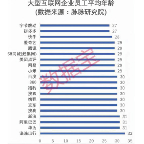 10月8日消息,MAIMAI發(fā)布調(diào)查顯示,大型互聯(lián)網(wǎng)企業(yè)員工平均年齡從27歲到33歲不等。其中字節(jié)跳動(dòng)和拼多多員工平均年齡相對(duì)最低,僅27歲。滴滴出行員工平均年齡最高,為33歲。大型互聯(lián)網(wǎng)企業(yè)員工平均年齡均不超35歲。