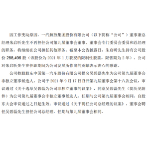 9月18日消息,一汽解放稱,董事兼總經(jīng)理朱啟昕不再擔(dān)任董事會(huì)董事、董事會(huì)專門(mén)委員會(huì)委員和總經(jīng)理職務(wù),將仍在公司擔(dān)任其他職務(wù)。朱啟昕持有公司股份288,496股。吳碧磊接任其職務(wù)。上半年公司凈利32.69億。