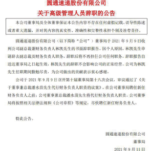 9月13日消息,圓通速遞稱,因個(gè)人原因,林凱辭去副總裁及財(cái)務(wù)負(fù)責(zé)人職務(wù),辭職后將不再擔(dān)任公司任何職務(wù)。林凱的辭職不會(huì)影響公司的正常經(jīng)營。在公司董事局聘任新任財(cái)務(wù)負(fù)責(zé)人之前,公司董事兼總裁潘水苗將代行財(cái)務(wù)負(fù)責(zé)人職責(zé)。
