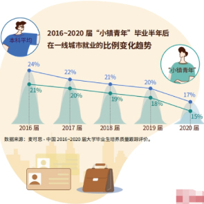 9月2日消息,MYCOS發(fā)布的數(shù)據(jù)顯示,近五年選擇到一線城市就業(yè)的小鎮(zhèn)青年比例成呈下降趨勢,不在一線城市就業(yè)的小鎮(zhèn)青年超七成選擇家鄉(xiāng)就業(yè)。小鎮(zhèn)青年就業(yè)初期職場表現(xiàn)不突出,畢業(yè)三年后表現(xiàn)亮眼,月收入和職位晉升比例雙高。