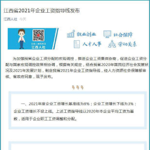 9月3日消息,江西省人社廳稱,結(jié)合江西省2020年國民經(jīng)濟(jì)社會發(fā)展?fàn)顩r及2021年發(fā)展計劃,江西省制定了2021年企業(yè)工資指導(dǎo)線,2021年度企業(yè)工資增長基準(zhǔn)線為8%,企業(yè)工資增長下線為3%,企業(yè)工資增長不設(shè)上線。