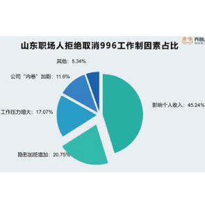 8月24日消息,齊魯人才網(wǎng)發(fā)布的調(diào)查顯示,山東企業(yè)雇主實(shí)行996意向大幅降低,近三成企業(yè)堅(jiān)決抵制。有30.27%和11.92%職場(chǎng)人表示非常抵觸或比較抵觸取消996,占比超四成。拒絕因素影響個(gè)人收入是第一要素,其占比達(dá)45.24%。