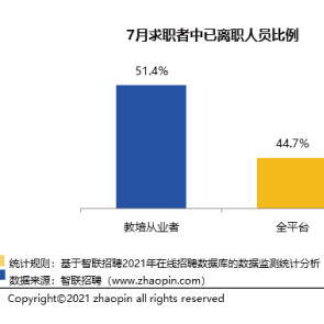 8月19日消息,智聯(lián)招聘發(fā)布的《2021教培行業(yè)人才市場(chǎng)分析報(bào)告》顯示,2021年7月求職原教培從業(yè)者中,51.4%為離職,高于全平臺(tái)活躍求職者的平均水平(44.7%)。在教培行業(yè)從事銷售業(yè)務(wù)的離職比例最高,近6成,教師/教務(wù)離職比例為51.2%。