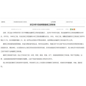7月29日消息,浙江省人民政府印發(fā)《通知》規(guī)定,自2021年8月1日起,將浙江全省最低月工資標準調(diào)整為2280元、2070元、1840元三檔,非全日制工作的最低小時工資標準調(diào)整為22元、20元、18元三檔。調(diào)整后的最低月工資標準三檔平均增長13.1%。