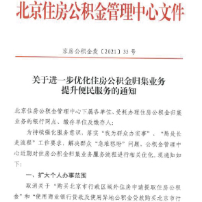 7月20日消息,北京住房公積金管理中心發(fā)布的《通知》顯示, 自今日起,繳存職工因購買北京市行政區(qū)域外住房,以及使用商業(yè)銀行貸款及使用異地公積金貸款購買北京市行政區(qū)域外住房的,均可由本人申請?zhí)崛∽》抗e金。