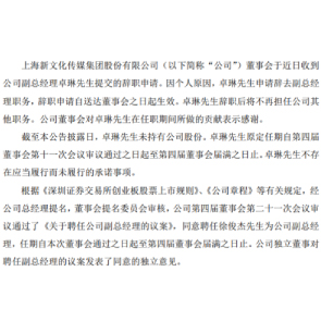 7月16日消息,新文化稱,因個(gè)人原因卓琳申請(qǐng)辭去副總經(jīng)理職務(wù)。卓琳辭職后將不再擔(dān)任公司其他職務(wù)。 同時(shí),聘任徐俊杰為公司副總經(jīng)理。徐俊杰1986年生,曾任東方天呈文化傳媒有限公司副總裁、上海水地比文化傳播有限公司總經(jīng)理等職。