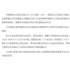 7月16日消息,中國(guó)核電稱,顧健因工作變動(dòng)原因辭去公司副總經(jīng)理職務(wù)。同時(shí),聘任陳富彬擔(dān)任公司副總經(jīng)理職務(wù)。陳富彬1969年生,歷任中國(guó)核工業(yè)總公司第五安裝工程公司焊接主任工程師等職務(wù),曾兼任中核浙能能源有限公司總經(jīng)理。