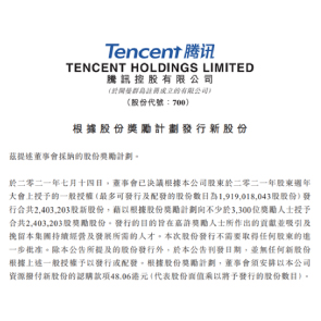 7月16日消息,騰訊控股稱,董事會已決議發(fā)行合計約240萬股新股份,根據股份獎勵計劃,擬向不少于3300位獎勵人士授予共約240萬股獎勵股份。按騰訊7月14日收盤價556.50港元/股計算,240萬股股份對應的市值約約11.12億人民幣。