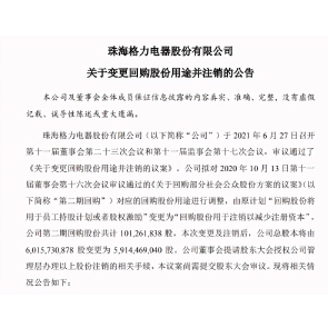 6月28日消息,格力電器審議通過《關(guān)于回購部分社會公眾股份方案議案》,格力電器第二期回購股份共計約1.01億股,在變更及注銷后,公司總股本將由60億股變更為59億股。此次變更第二期回購股份用途并注銷是公司結(jié)合目前實際情況作出的決策。