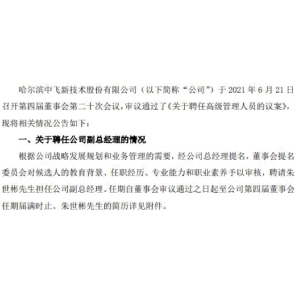 6月22日消息,中飛股份公告稱,經(jīng)公司總經(jīng)理提名,董事會提名委員會對候選人的教育背景、任職經(jīng)歷、專業(yè)能力和職業(yè)素養(yǎng)予以審核,聘請朱世彬先生擔(dān)任公司副總經(jīng)理。中飛股份的董事長是朱世會54歲,碩士學(xué)歷。 總經(jīng)理是龔濤50歲。