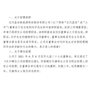 6月9日消息,北汽藍(lán)谷稱,因工作調(diào)整原因,劉宇不再擔(dān)任公司經(jīng)理職務(wù),辭職后劉宇繼續(xù)任公司董事長(zhǎng)等職。同時(shí),聘任代康偉作為職業(yè)經(jīng)理人擔(dān)任公司經(jīng)理。代康偉女,1983年生,歷任北汽福田研究院新能源技術(shù)中心軟件開(kāi)發(fā)工程師等職。