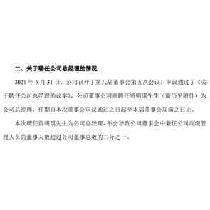 6月1日消息,亞太實業(yè)稱,楊銳軍因個人工作變動原因申請辭去公司總經(jīng)理職務,辭職后不在公司及子公司擔任任何職務。同時,聘任賈明琪為公司總經(jīng)理。賈明琪于2018年9月入職公司,曾任華瑞農(nóng)業(yè)獨立董事,中國財務管理學會理事等職。