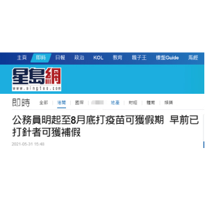 6月1日消息,香港公務(wù)員事務(wù)局稱,公務(wù)員及政府雇員6月1日起至8月底,接種疫苗每劑可獲一日假期。此前接種疫苗人士亦可獲許補(bǔ)假,2021年3月底前申請(qǐng)。除公務(wù)員接種疫苗有假期,政府也與各界合作,推出多項(xiàng)疫苗獎(jiǎng)賞。