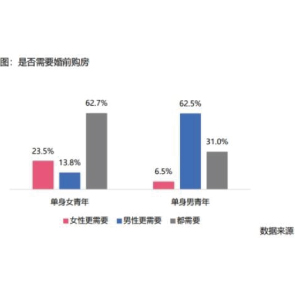 5月20日消息,貝殼研究院發(fā)布的《單身青年安家置業(yè)調(diào)研報告》顯示,七成單身青年想買房,近半購房預算低于百萬。超六成女青年稱需婚前購房,90后對伴侶是否有房最寬容。另外77%單身女青年表示愿與伴侶承擔首付。