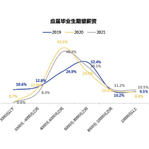 5月12日消息,智聯(lián)招聘發(fā)布的《2021大學(xué)生就業(yè)力調(diào)研》顯示,2021應(yīng)屆畢業(yè)生的期望薪資同比有所上升,但不及2019年。應(yīng)屆畢業(yè)生期望薪資分布聚焦在4000-6000元區(qū)間內(nèi)。反觀2019應(yīng)屆生薪資期望在6000-8000元區(qū)間達(dá)到高峰。