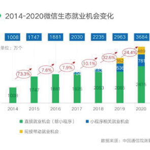 4月23日消息,中國信通院發(fā)布的《數(shù)字化就業(yè)新職業(yè)新崗位報(bào)告》顯示,由公眾號(hào)、小程序、視頻號(hào)、微信支付、企業(yè)微信等共同構(gòu)成的微信生態(tài),在2020年衍生就業(yè)機(jī)會(huì)3684萬個(gè),同比增長24.4%。微信生態(tài)以數(shù)字化能力催生新職業(yè)新工種新崗位。