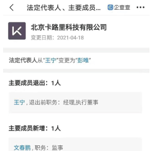 4月20日消息,據(jù)天眼查APP顯示,Keep關(guān)聯(lián)公司北京卡路里科技有限公司發(fā)生工商變更,王寧退出該公司法定代表人,由彭唯接任,同時(shí)王寧退出該公司經(jīng)理、執(zhí)行董事職務(wù)。股東信息顯示,該公司由王寧、彭唯、文春鵬、劉冬共同持股。