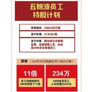 4月20日消息,五糧液稱,鎖定期3年的員工持股計(jì)劃將于2021年4月19日屆滿,迎來解禁,于4月20日正式上市流通。截至4月16日,五糧液收盤價(jià)為261.80元,這意味著員工持股3年時(shí)間股價(jià)漲了11倍,2400余名員工人均浮盈234萬元。