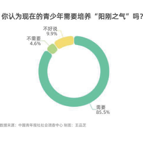4月15日消息,中國青年報發(fā)布的調(diào)查顯示,85.5%的受訪者認(rèn)為現(xiàn)在的青少年需要培養(yǎng)“陽剛之氣”,4.6%的受訪者覺得不需要,9.9%的受訪者表示不好說。同時,加強(qiáng)陽剛教育,86.8%的受訪者認(rèn)為要注重增強(qiáng)責(zé)任意識、團(tuán)隊精神。