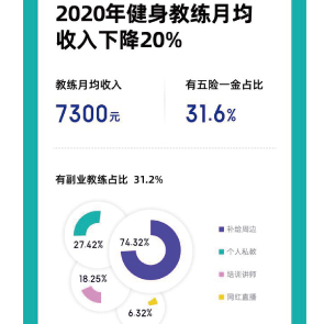 3月23日消息,由上海體育學院經(jīng)濟管理學院和三體云智能科技編寫的《2020中國健身行業(yè)數(shù)據(jù)報告》顯示,中國整個健身行業(yè)的健身會員數(shù)約為7029萬(不含港澳臺),健身人口滲透率為5.02%,環(huán)比去年增幅3.19%。教練月均收入7300元,有五險一金占比31.6%,有副業(yè)教練占比31.2%.