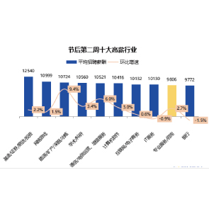 3月12日消息,智聯(lián)招聘發(fā)布的就業(yè)行情周報顯示,節(jié)后復(fù)工第二周2021年2月25日至3月3日,全國有35個城市平均招聘薪酬較上一周小幅上升。蘭州、太原、大連的最為亮眼,分別環(huán)比上升7.1%、6.3%、5.9%?;?證券業(yè)仍居首達12540元/月。