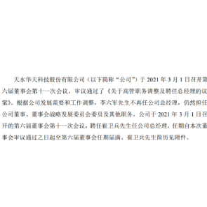 3月3日消息,華天科技稱,根據(jù)公司發(fā)展需要和工作調(diào)整,李六軍不再任總經(jīng)理,仍任董事、董事會戰(zhàn)略發(fā)展委員會委員及其他職務(wù),李六軍持有公司17772股股份。同時,聘任崔衛(wèi)兵任公司總經(jīng)理,其現(xiàn)任天水華天科技股份有限公司董事。