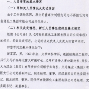 3月3日消息,河南能源化工集團(tuán)稱,由于工作調(diào)動原因,河南能源化工集團(tuán)原董事長劉銀志不再擔(dān)任河南能源法定代表人。同時,法定代表人變更為田富軍。田富軍歷任義馬礦務(wù)局北露天礦副礦長,義馬礦務(wù)局人事處副處長等職。