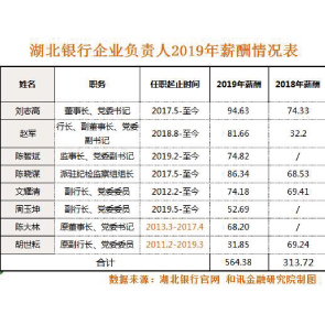 2月24日消息,截至目前薪酬公示,湖北銀行披露,8名高管中已有兩位從銀行離職,分別是原董事長陳大林和原副行長胡世耘。相比2018年,湖北銀行高管薪酬均有所增加,其中董事長劉志高2019年領(lǐng)薪94.63萬元,較上年增加27%。