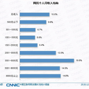2月9日消息,中國互聯(lián)絡(luò)信息中心發(fā)布的第47次《中國互聯(lián)網(wǎng)發(fā)展?fàn)顩r統(tǒng)計(jì)報(bào)告》顯示,截止2020年12月全國網(wǎng)民規(guī)模已達(dá)9.89億。其中僅三成網(wǎng)民月收入在5000元以上。另外,2019年北京月入過萬的占35.07%,即100個(gè)從業(yè)者中,只35個(gè)人能實(shí)現(xiàn)月入過萬。