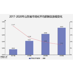 2月8日消息,齊魯人才網(wǎng)發(fā)布的《2020年山東省年度市場化平均薪酬報告》顯示,從2017-2020年山東省市場化平均薪酬呈平穩(wěn)上漲趨勢。2017年市場化平均薪酬為4924元,2018年5562元,2019年6090元,2020年漲幅為7.72%,市場化平均薪酬為6560元。