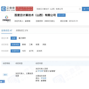 2月5日消息,企查查APP顯示,百度云計算技術(shù)(山西)有限公司發(fā)生工商變更,法定代表人從尹世明變更為崔珊珊。該公司由百度(香港)有限公司全資持股。尹世明2016年11月21日加入百度,曾任百度副總裁,百度智能云事業(yè)群組總經(jīng)理。