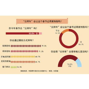 2月4日消息,中國青年報發(fā)布的調(diào)查顯示,93.0%的受訪者2021年春節(jié)會云拜年,視頻連線、語音連線是主要的云拜年形式。86.0%的受訪者表示云拜年會讓這個春節(jié)過得更特別。交互分析發(fā)現(xiàn),90后對此最為認(rèn)同(86.9%),其次是80后(86.1%)。