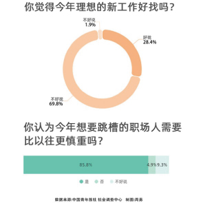12月25日消息,中國(guó)青年報(bào)發(fā)布的調(diào)查顯示,69.8%受訪職場(chǎng)人士覺(jué)得2020年理想的新工作不好找,28.4%受訪職場(chǎng)人士覺(jué)得好找。85.8%受訪職場(chǎng)人士認(rèn)為2020年跳槽應(yīng)該更慎重。另外,79.2%受訪職場(chǎng)人士2020年動(dòng)過(guò)跳槽的念頭。