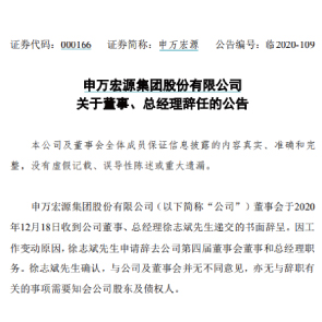 12月21日消息,申萬宏源集團(tuán)股份有限公司稱,公司董事、總經(jīng)理徐志斌辭任公司董事會(huì)董事和總經(jīng)理職務(wù)。聘任黃昊擔(dān)任公司總經(jīng)理職務(wù),黃昊此前在中央?yún)R金任綜合管理部主任。 同時(shí)副總經(jīng)理、財(cái)務(wù)總監(jiān)、董事會(huì)秘書陽昌云離職。