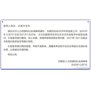 12月10日消息,杭州市人社局發(fā)布的《通知》規(guī)定,自2020年12月10日至2021年1月20日,全市應屆高學歷畢業(yè)生生活補貼暫停補貼資金撥付。期間網(wǎng)上申請、受理審核等流程正常開展,2021年1月21日起恢復補貼資金正常撥付流程。