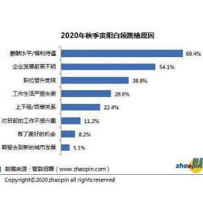 12月7日消息,智聯(lián)招聘發(fā)布的《智聯(lián)招聘2020年秋季貴陽(yáng)白領(lǐng)跳槽及職業(yè)發(fā)展調(diào)研報(bào)告》顯示,2020年秋季貴陽(yáng)白領(lǐng)超6成有跳槽行動(dòng),薪酬不滿意是主要原因。87%貴陽(yáng)白領(lǐng)認(rèn)為找工作難度高于往年。仍有超4成會(huì)選擇裸辭。