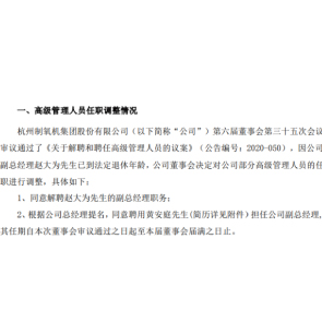 11月13日消息,杭氧股份稱,因副總經(jīng)理趙大為已到法定退休年齡解聘其職務(wù),聘用黃安庭擔任副總經(jīng)理,辭職后趙大為仍任董事職務(wù),持有公司股份425,427股。黃安庭1972年生,2019年12月至今任杭州制氧機集團股份有限公司黨委委員等職。
