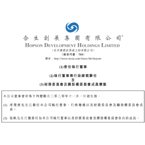 11月3日消息,合生創(chuàng)展稱,席榮貴因希望投入更多時(shí)間處理其個(gè)人事務(wù),辭任公司執(zhí)董、行政總裁及財(cái)務(wù)委員會(huì)及購股權(quán)委員會(huì)成員。同時(shí),張帆獲委任為公司執(zhí)董及財(cái)務(wù)委員會(huì)及購股權(quán)委員會(huì)各自的成員。