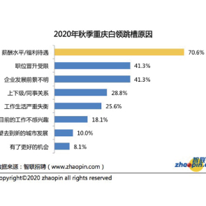 11月3日消息,智聯(lián)招聘發(fā)布的《2020年秋季重慶白領(lǐng)跳槽及職業(yè)發(fā)展調(diào)研報告》顯示,2020年秋季重慶白領(lǐng)7成有跳槽行動,不滿薪酬是主因。值得關(guān)注的是,59.9%受訪白領(lǐng)表達了不同程度的焦慮。94%重慶白領(lǐng)愿努力奮斗以期在職場中獲得更多回報。