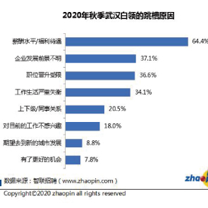 11月3日消息,智聯(lián)招聘發(fā)布的報告顯示,2020年秋季,有跳槽行動的武漢白領(lǐng)比例為67.6%,高于2019年同期的64.2%。64.4%的武漢白領(lǐng)表示薪酬水平/福利待遇是跳槽的主因,近9成武漢白領(lǐng)認為找工作難度高于往年,仍有超3成會選擇裸辭。