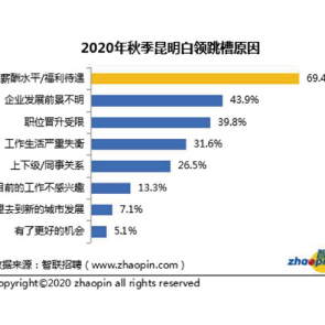 11月3日消息,智聯(lián)招聘發(fā)布的《2020年秋季昆明白領(lǐng)跳槽及職業(yè)發(fā)展調(diào)研報告》顯示,2020年秋季昆明有跳槽行動的白領(lǐng)為58.6%,與2019年同期62.1%有所下降,69.4%表示薪酬待遇為主因。同時,白領(lǐng)事業(yè)信心指數(shù)為2.72。