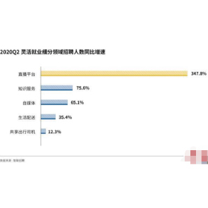 10月12日消息,智聯(lián)招聘發(fā)布的《2020雇傭關(guān)系趨勢(shì)報(bào)告(三)——新格局下的新就業(yè)形態(tài)》顯示,在2020年第二季度,直播平臺(tái)以347.8%的增速?gòu)?qiáng)勢(shì)領(lǐng)跑靈活就業(yè)招聘需求,知識(shí)服務(wù)、自媒體、生活配送分別增長(zhǎng)75.6%、65.1%、35.4%。