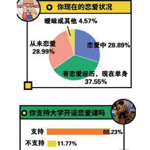 10月13日消息,中青校媒發(fā)布的調(diào)查顯示,88.23%的大學(xué)生支持大學(xué)開設(shè)戀愛課。如何解決戀愛中的矛盾和分歧、如何面對(duì)感情結(jié)束是大學(xué)生希望在戀愛課上學(xué)習(xí)到的內(nèi)容,分別占71.79%和71.50%。55.54%認(rèn)為幫助青年樹立正確的愛情觀是戀愛課最重要意義。