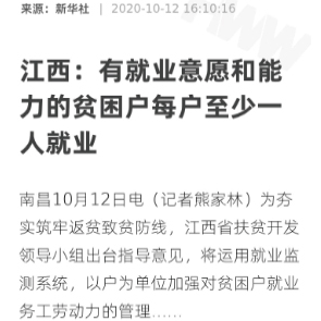 10月13日消息,江西省扶貧開發(fā)領(lǐng)導(dǎo)小組出臺(tái)指導(dǎo)意見,將運(yùn)用就業(yè)監(jiān)測(cè)系統(tǒng),以戶為單位加強(qiáng)對(duì)貧困戶就業(yè)務(wù)工勞動(dòng)力的管理,確保有就業(yè)意愿和就業(yè)能力的貧困戶每戶至少實(shí)現(xiàn)一人就業(yè)。要組織就業(yè)扶貧工作專班,深入省內(nèi)外駐點(diǎn)穩(wěn)崗?fù)貚?,“點(diǎn)對(duì)點(diǎn)”幫扶輸送。