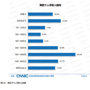 9月30日消息,CNNIC發(fā)布的《中國互聯(lián)網(wǎng)絡(luò)發(fā)展?fàn)顩r統(tǒng)計報告》顯示,截至2020年6月,全國網(wǎng)民規(guī)模達9.40億,互聯(lián)網(wǎng)普及率達67.0%。月入收入在2001-5000元的網(wǎng)民占32.%,5000元以上的占24.2%,但約2成月收入在1000元及以下。