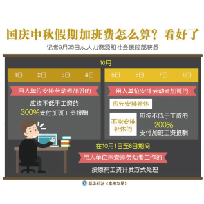 9月28日消息,人社部就2020年國(guó)慶節(jié)、中秋節(jié)假期加班工資計(jì)算問題進(jìn)行明確。10月1日至4日勞動(dòng)者加班的,應(yīng)按不低于工資的300%支付加班工資。10月5日至8日,加班的應(yīng)先安排補(bǔ)休,不能補(bǔ)休的,應(yīng)按不低于工資的200%支付。